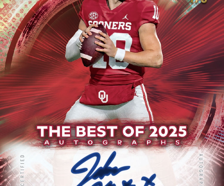 Signature content takes it up a notch with Best of 2025 Autographs featuring 100 top prospects, alongside all-new Greatness Awaits and Workhorse Signatures that spotlight defining moments and future stars. Triple and Dual Autographs, each with limited parallels, offer once-in-a-Hobby combinations, while Jumbo Relic Autographs debut the first-ever Game-Used relic autos in an NIL football product. These hobby-only cards combine authentic game-used memorabilia with autographs from the college game's brightest names, delivering unmatched authenticity and collector appeal. Dual relic autos with low-numbered patch parallels bring even more heat to this historic checklist.